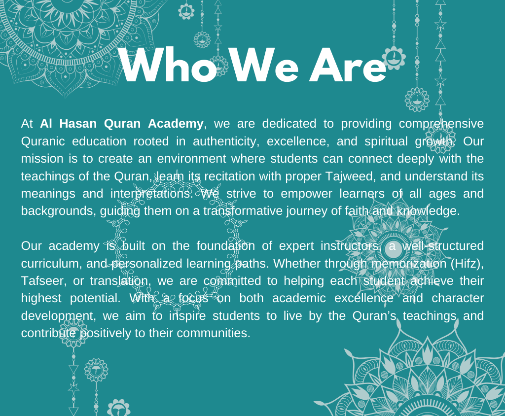 At Al Hasan Quran Academy, our primary goal is to provide the best education in Quranic studies and Islamic knowledge, nurturing both minds and souls.